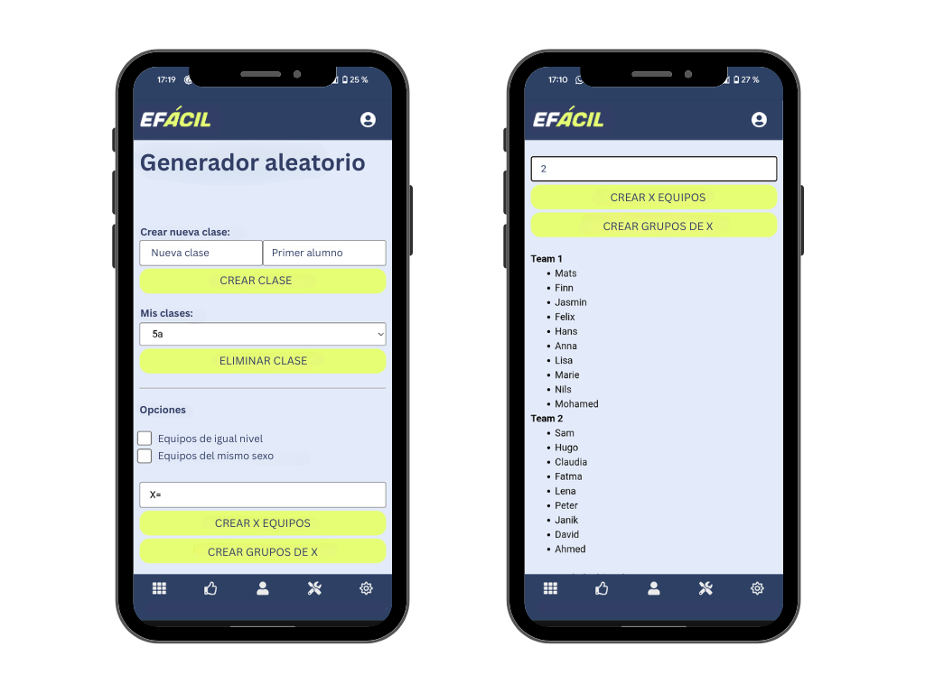 ¿Cansado de discusiones interminables al dividir equipos? ¡El generador aleatorio de EFácil tiene la solución! Con un solo clic puedes crear equipos aleatorios a partir de las clases que hayas configurado.