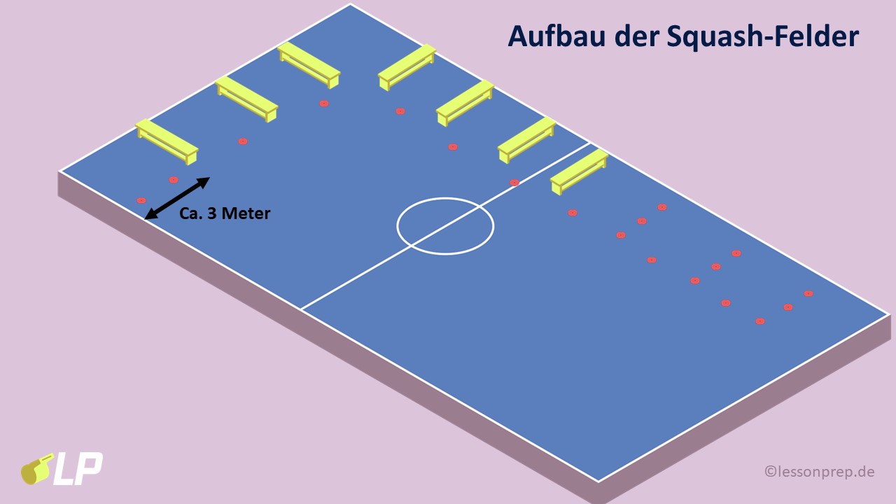 - Doppel-Squash Turnier ist theoretisch auch möglich, doch Erfahrung haben gezeigt, dass die SuS sich zu Viert auf dem Feld häufig gegenseitig im Weg stehen.