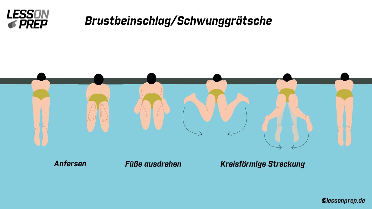 - Anhand einzelner bei den SuS beobachteten technischen Fehlern (z.B. «Scheren-Beinschlag», kein Ausdrehen der Füße, …) werden die 3 Knotenpunkte einer richtigen Brustbeinschlag-Technik erklärt und mit Hilfe der Bilder gezeigt.